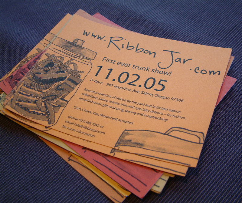 If you click on that it will open up big enough to read. We’re having our first trunk show! I am really excited about this because ribbon is such a tactile thing and I can’t wait for people to be able to feel it and see it in person. Also I have been putting together limited edition ribbon collections in awesome jars. I think Sciarrino and I found all the cool jars in Salem. I’ll get pictures of them tomorrow. It’s something I get questions about all the time: 1. Do you sell jars? 2.Does the ribbon come in jars? and 3.Can you make up collections? So I thought I would make some up for the show and see how they do. I’ve also been cranking out tags and stuff to have some other goodies besides just the ribbon. More pictures tomorrow!