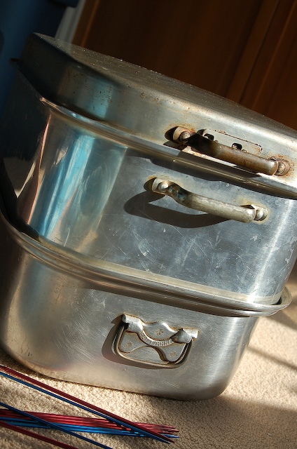 Barn sales: the further off the beaten path the better. And the one we went to was glorious. I saw people leaving with huge metal tubs and cool things, but no reason to feel bitter. I got 2 sets of metal double point needles (something ON my list) for a quarter, and my mom spotted a fantastic HUGE double boiler for me for three dollars. I’m going to use it for dying, it’s so perfect. And today on my way home from the post office I saw another estate sale and stopped in for a quick look around, same boiler, only eight dollars.