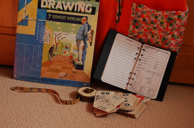 Garage sales: these are really hit and miss. This time: some jars, an old card game, a five dollar tape measure worth every penny, a one dollar book on painting with perspective, has a great cover that I plan on framing, a "lunch lady apron" that is orange and zips down the front, for messy projects, also a dollar. Fifty cents for a camping log book. The carport this sale was in smelled HORRIBLE, but I toughed it out. Going to pull the pages out of the book and scrapbook with it.