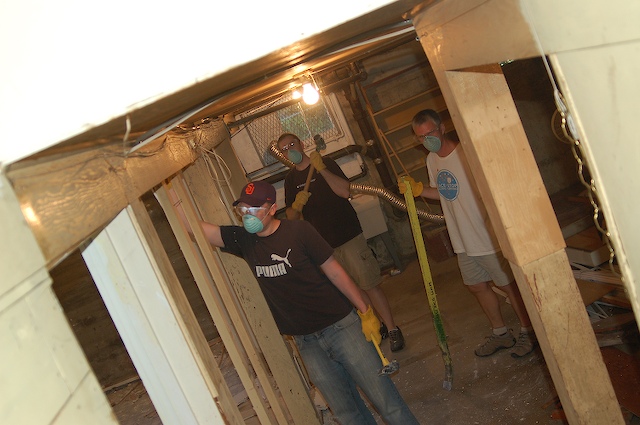 I didn’t get too many action shots because I was upstairs working with my mom. But Bill was worth his weight in gold yesterday. I totally had a freak out crying moment in the morning, like what did I get myself into thing, and he totally came through. Took down the first wall by himself (the one separating the storage rooms that had termite damage) and then Bj showed up and they took out more walls, then Matt was sweet enough to drive down from Portland and help tear down the big wall in the middle. Matt said he’d always wanted to sledge hammer a wall – happy to oblige Matt! Then these wonderful guys pulled back a window and got all the wood up onto the drive way, it will be a ton easier to transfer into the dumpster that comes tomorrow this way. In the process Matt got a nail through his shoe, and into his foot. Ew. Matt go get your tetanus shot!!! Meanwhile mom painted the ceilings in the part of the house that is not coved (bedrooms, and hallway) and I took every piece of hard ware out of the walls, doors, cupboards, all of it. The floors start to get worked on Wednesday and they take 3-5 days, so I want to try and get a lot of things done before hand, like wall patching, so that we can paint right after they are done.