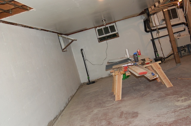 Anyway by about five we had finished almost everything up with the first brushed coat, and we needed more drylok. I took Taylor home, went to Home Depot, got dinner and came back. My mom and I worked for a while, then Sciarrino showed up (“hello my bestest buddy in town can you please please come help me!”) to patch the holes in all the moldings around the windows and doors and everything. My mom stayed until eight and Sciarrino and I until nine. And when we left it looked like this: