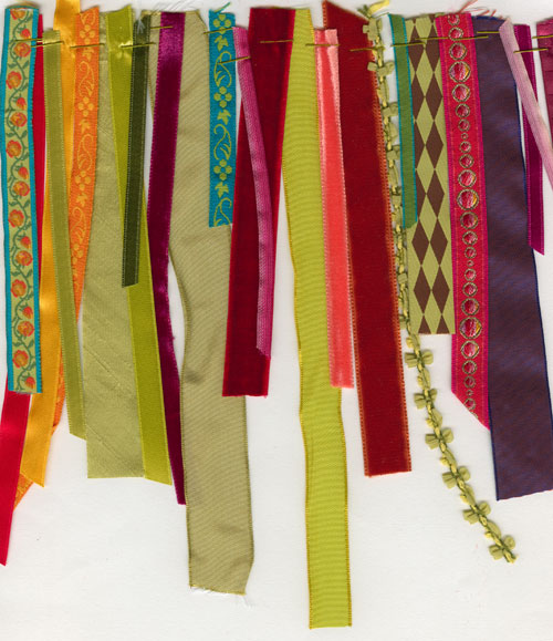 I went through my bits and pieces of ribbon this afternoon before I left for our appointment with the wedding coordinator. I’m thinking really colorful with a nice green/chartreuse base. What do you think? I might add something brighter since it’s March 31st and not really winter, but it should still be nice and gray outside. And hopefully a little wet at least. I love that moody weather.