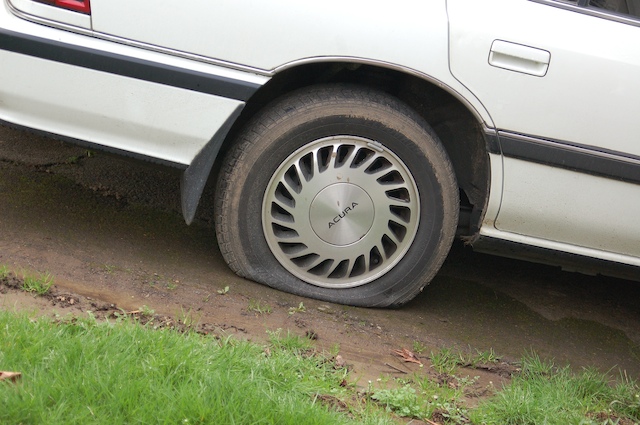 Sure, seeing this flat tire wasn’t the best part of my day, but I did know it was coming, yesterday the tire was almost flat. And it makes me feel like the $36.50 I pay AAA is worth it when they send someone to come do something for me. Turns out I got a nail through the sidewall and it couldn’t be fixed. I’m guessing from pulling into that mud there, remember the pile of crap I had in that very spot last summer? I suppose there is the possibility I forgot a nail (or forty). So I need a new tire, only they don’t make that tire, so I had to get two. But the funny thing is I wasn’t all that upset hearing the news, maybe it was because I had picked up some Chinese food on the way over and was munching on it while I waited. And the drive home was super fantastic with the birds singing and the sun being out.