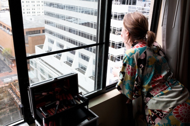 Bj getting the note. I wrote it on the packaging for my hosiery. And circled where it said "one pair" because I’m cheesy like that. This is also the only picture of any of the six umbrellas we rented from Bella Umbrella. They were all wickedly cool and vintage with ruffles and jeweled handles. And it poured when we were dashing over to the church in cars, but after that, not a drop. I knew it would happen though, come on, if I had not had any cover prepared it would have been super rainy! Back to my room…