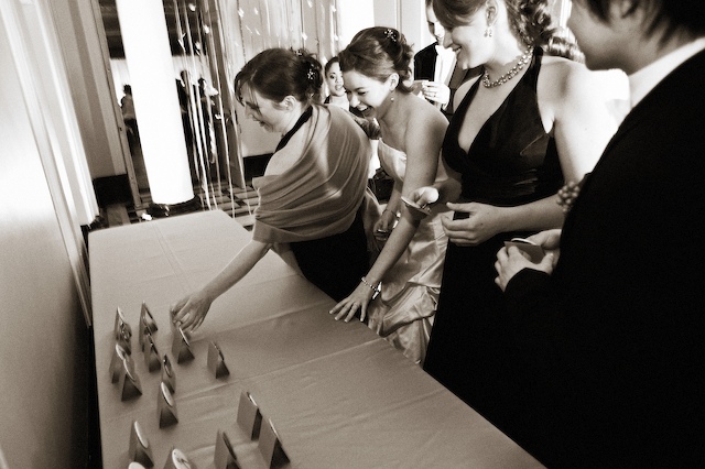 Bj wanted to have a door prize, to which I was like, "what?" I had never heard of anyone doing that so we came up with this compromise. We had three boxes that corresponded to three keys on the place cards. Our guests went to try their key and the winners got one of three things: an iPod shuffle with "WHG+ALP and our wedding date engraved on the back", a titanium spork, and a DVD of Zoolander. Each gift had a note about why that thing was important to us (we love Apple, we had a year long bet about a spork, and Zoolander was our first date). Oh and before I forget, check out those trees. They were picked by our dear family friends and my dad had them brought up, we put little spots on them and they just added the perfect touch to the room. We also had a candy bar: