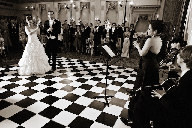 I chose that black and white floor instead of the normal wood one and love it. Totally went with our black tie dress code. So Ceara sang our first dance as well, which was just so amazing. Brian and Melissa accompanied her so beautifully. It was the same song they did at the