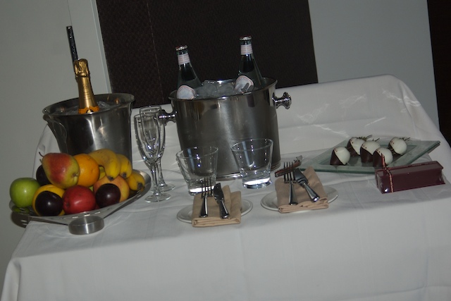 Bj and I stow his bag and Pete’s in the (totally and amazing accented with green) room and go downstairs to look around. The place is all inclusive, they don’t want you leaving to go back to the strip. So there is a big casino, spa, bowling alley (72 lanes), movie theater, pools, clubs, restaurants, you get the idea. We complete a lap, barely going outside in the 110 degree heat (I’m melting, I’m melting) and then head back up to the room to change for the dinner. Once we get up there we find a little treat has been left for us: