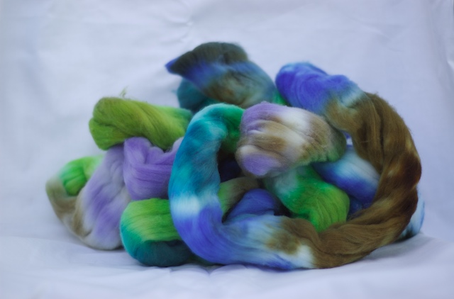 I have a bunch of emails to answer, so if some are yours sorry! One of the emails I got was a request to go over how you spin yarn. Sure! Now just remember I’m no expert, I’ve taken a few lessons, but I still feel like I only know the basics. So basically you need a fiber and something to spin it with. I use a wheel, but there are also drop spindles, cheaper, but they look like it might take a herculean amount of hand eye coordination to figure out. I think that might be a personal problem on my part though :). So the fiber. If you go out and get some fiber straight from the sheep (or other animal) than you’ll need to clean it and line it up right (a hand or drum carder is used for this). Then you can dye it if you want (you can actually dye it before or after you line it up). Now I tried all of this, and sure you save a little bit of money going this route, but dude it’s messy and time consuming. What I have found more fun is buying super cool dyed commercial top (commercial top is all lined up right and so soft and perfect, spinning it is a breeze), like this: