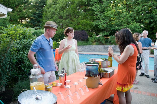 From the left: my mom’s friend from I think middle school, Kim. She gave her this framed picture of my mom on cheer squad when they were really young, so cute, long pigtails! Then Bill’s mom, Bill (my partner in crime), and Kim’s husband. I didn’t get pictures of all the food we spend forever working on but I did a french type potato salad, a yummy fresh fruit salad, and BBQ burritos (pastrami, peppers, onions, pepperjack cheese, tomatoes in a flour tortilla then grilled in foil). We also had chips and dips along with the bar my brother set up: lemon drops, pops, beers, wine, water and the lemonade. Full disclosure: my mom did end up helping chop veggies a bit. She’s so fast at that kind of thing!