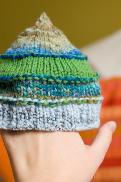 Okay I frogged it (knit speak for ripping it back, in this case all the way). Sciarrino came over last night and when I told her that I was bravely going to knit on she mentioned knitting the net row on a long cord just to check things out. I did and then put it on my head, where it slipped right down to my neck. So that was a no go. I figured out read in the very clearly written pattern that you decrease by 8 stitches for a smaller size. So I cast on 48 stitches which means I knit this adorable thing up in a couple of hours: