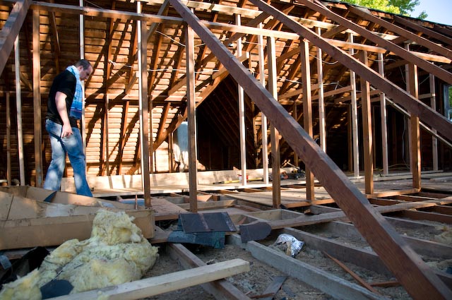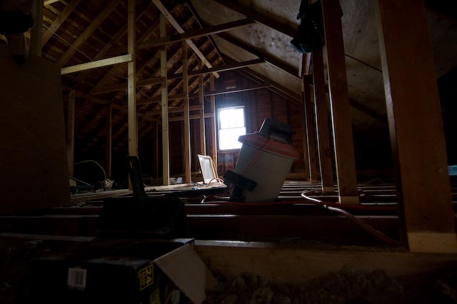 This is what our attic looked like about a week ago. We started demo with out our permit (not illegal or anything, just risky because you can’t actually build until you get the permit). Guess what? Our permit had hold ups, we had to get new drawings (which was terrible because the guy doing the drawings is the slowest on earth), and then it started raining. So they put up plywood and tarps and we haven’t had any problems with that (except the house is COLD). Well yesterday we got our permit! I am so thankful for this. Seriously I was going out of my mind with worry. Now the upstairs looks like this: