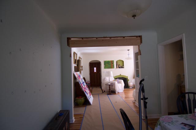 I took a lot of our pictures down, the furniture is covered, the dining room table smooched to one side so they can get out to this: