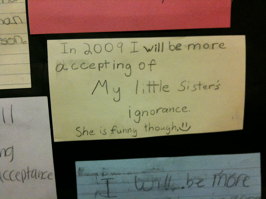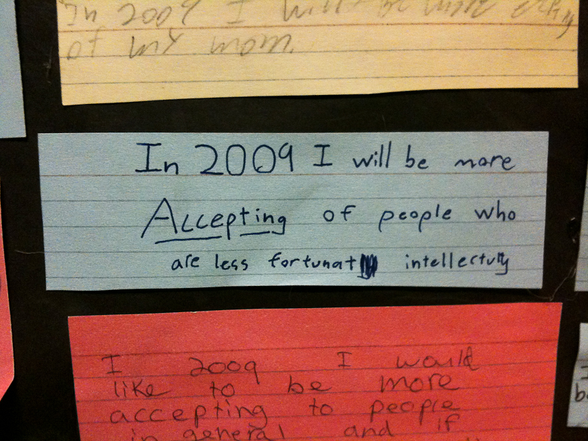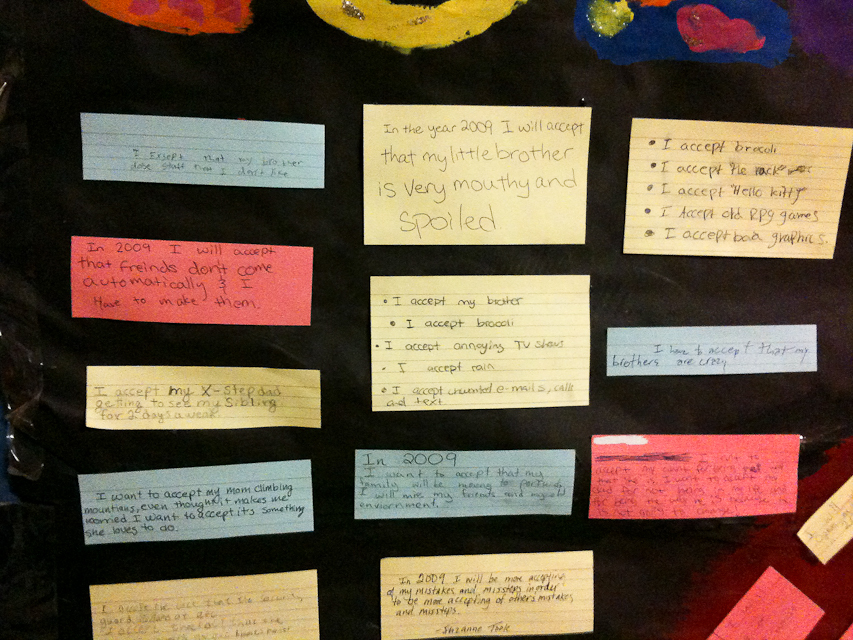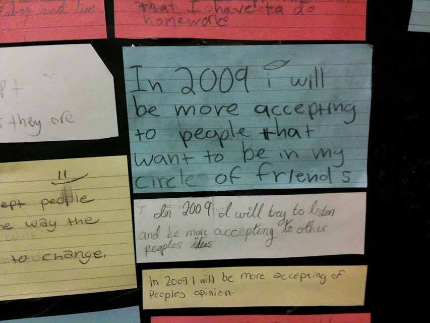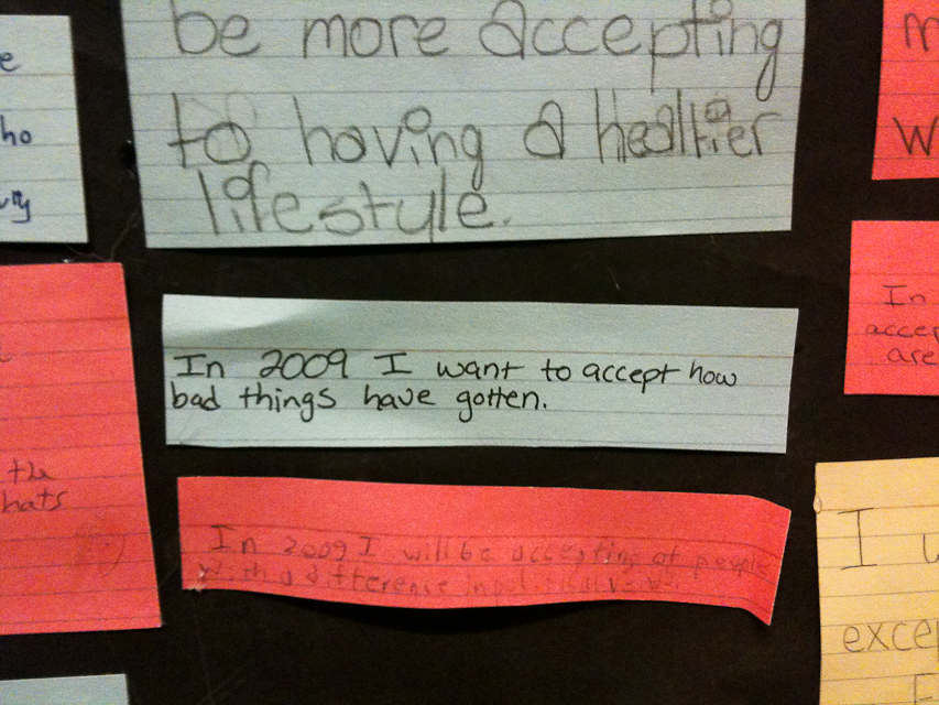 Kristen from Lovely Lydia Design and I are taking a photography lighting class through the local community college. This class happens to be in a public middle school. On a bathroom break we spotted a gem of a poster, made a few years ago. It was a giant rainbow and each student must have been given an index card to write what they were going to be more accepting of in 2009. The rainbow was to signify colors of people and other differences. Some students went another way with what they were going to accept in 2009.