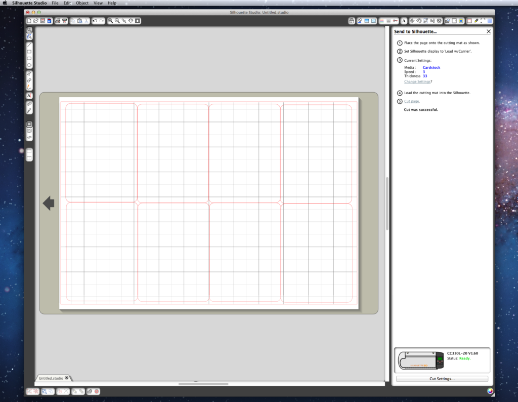 edited to add (8/2013) Since people are downloading this file again I thought I would update it with the more recent card sizes, they are bigger now, very nearly 3×4. Here is that version to download, enjoy! The margins are scant on the Silhouette so make sure you reveal cutting mat and position your 8×12 inch paper perfectly!