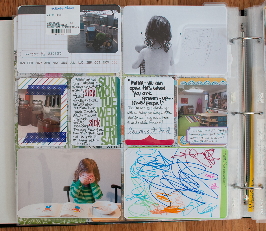 The back of that artwork was this mini layout. I had to cut and resize all the photos I wanted on there, and it was still crammed. I’ve only done little layouts a few times in the book, but it works great for time specific things. If I’m feeling all mushy about something I’ll probably just do a regular layout for one of our regular scrapbooks.