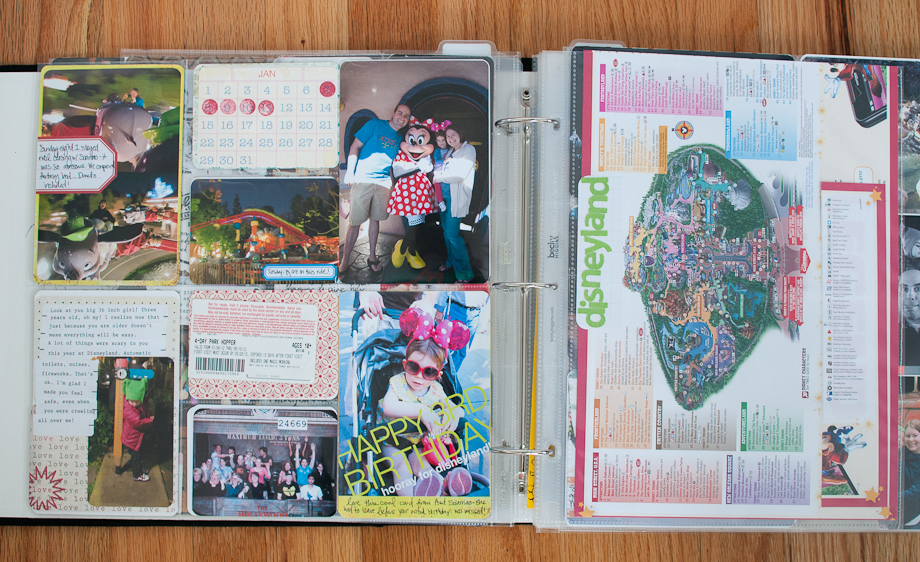 Disneyland. Because the time we spent in Disneyland bridged two weeks I felt it was easier to do a spread pre-Disney, Disney, and post Disney (two weeks, into three spreads). And Disneyland also included the map insert (cut down 12×12 protector), a 12×12 with a dozen more disney pics, and a big storage envelope (besides trip stuff, this also holds cards from Tuesday’s birthday, which fell during this time). Because it’s all clearly Disney I don’t think it’s hard to read the “spread” as one. But usually if I do an insert I make sure it is not quite 12″ wide, so it fits in-between the pages.