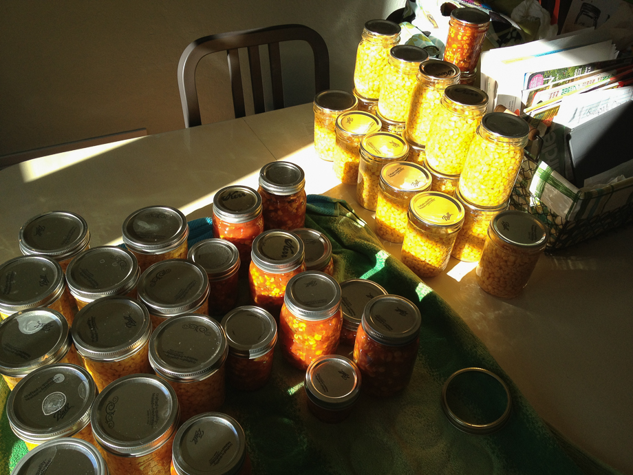 It’s a good thing because here is a little bit of what we put up (roasted corn salsa in the foreground, behind that canned whole kernel corn). Despite two MEGA days of canning I still ended up with ten bags of corn in a neighbor’s freezer! Good thing we have awesome neighbor’s who answer late night text pleas for space in their deep freeze! I’ve already traded that for some of Erin’s eggs, yum, yum!