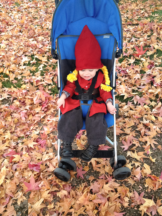 I decided at the last minute (10 o’clock the night before) that Bennet needed a coat to complete her gnome costume (and make it a bit different from my god daughter’s, since I was recycling most of the outfit). And her hat turned out a little pope-esque. Oops. I blame it on the fact that I had no pattern and was knitting under the table at jury duty without looking (because apparently knitting needles are banned there. No way was I going to sit there all day without them).