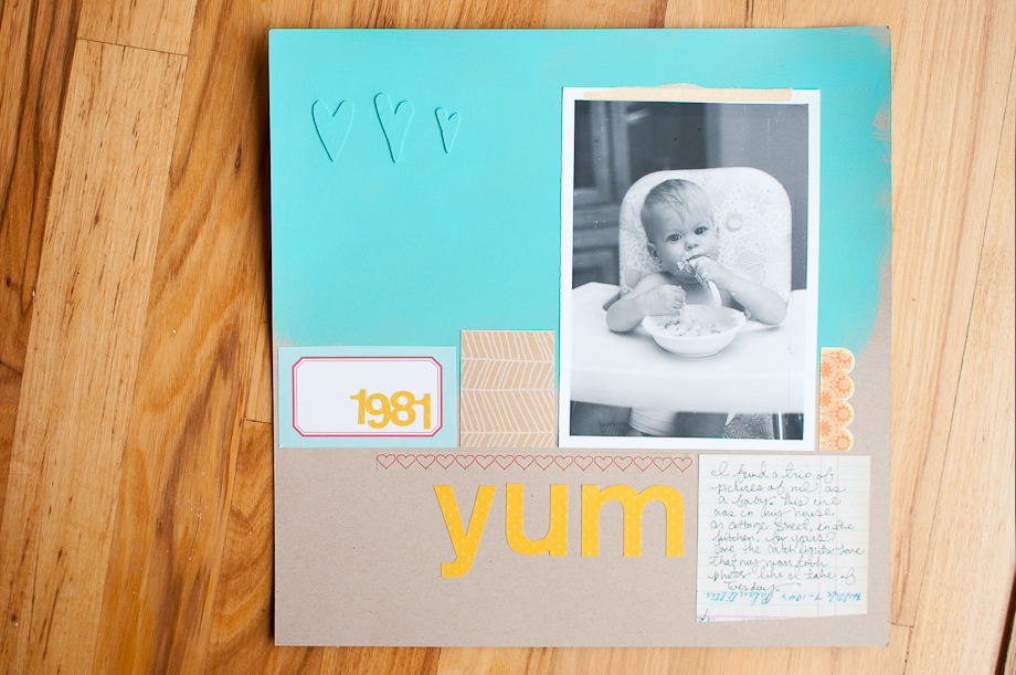 This is one of my favorite layouts in a while. I think I’ve had the base done for a few months now… I was just waiting to get the right paper into my Silhouette for the title and year. I painted on this layout (maybe even as far back as our beach retreat?), so it’s a bit warped but I don’t really mind. In my re-organizing for Project Life, I pulled out some of my smaller scraps for a separate dish. I think I’m going to be digging into those a lot. And yes, Project Life is easy. You DON’T need a lot of stuff, I’ve just found that I leave it out a lot, and want to slip little bits in constantly so it warranted a re-arrangement of sorts. And that Honey Dotted Swiss? I’m pretty sure I need a giant pack of it. It’s such the perfect color of mustard! -