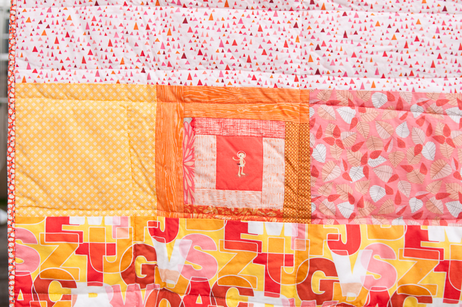 I have been making this style of quilt for a while to highlight a favorite or orphan (leftover from another quilt) block. Sometimes I use four blocks as in this quilt I sold on Etsy. I love the simplicity of these quilts and the ability to showcase large prints (isn’t that alphabet fun??).