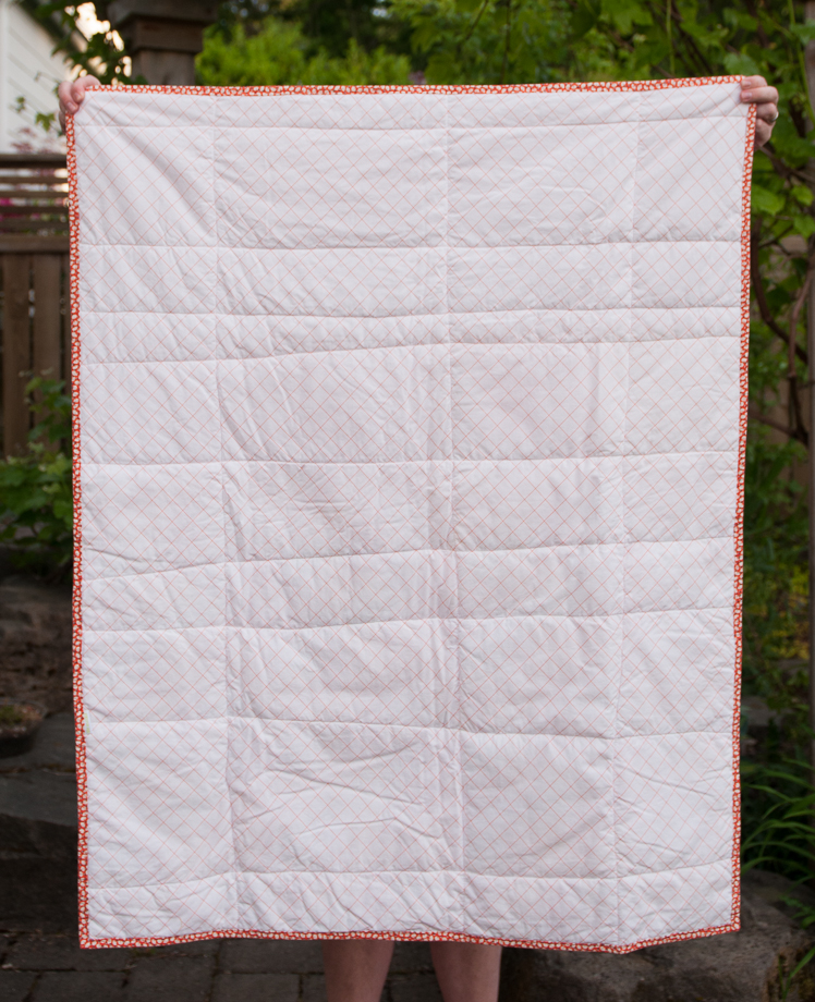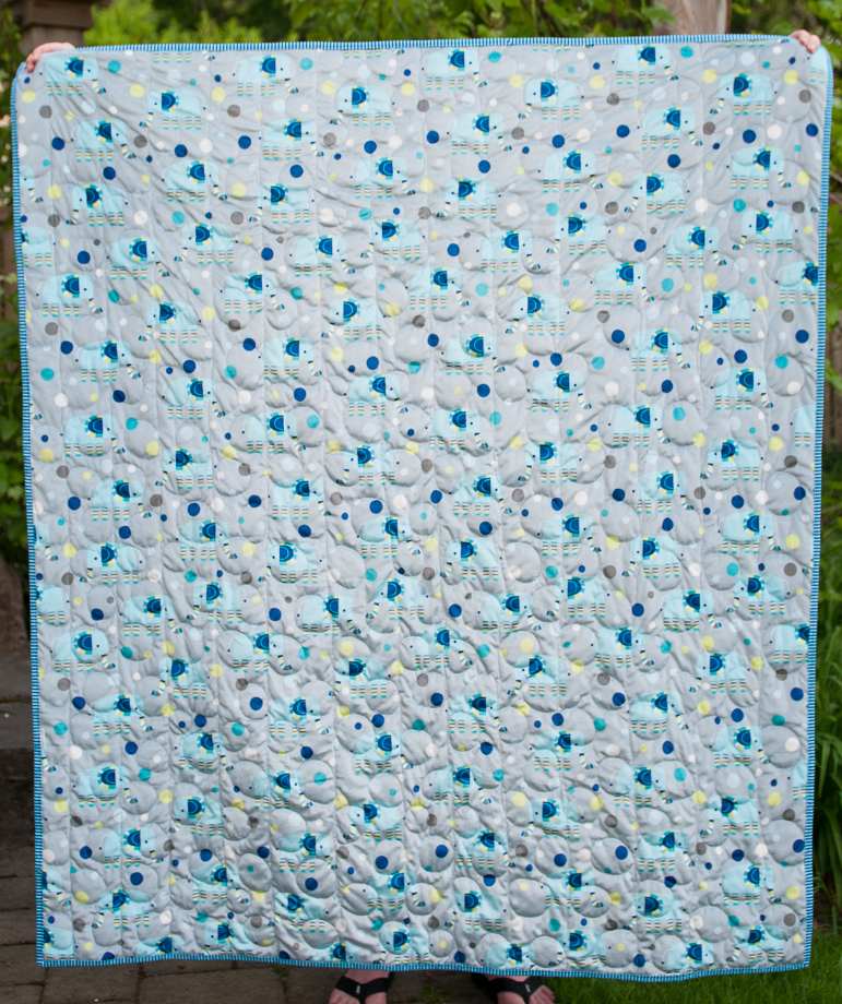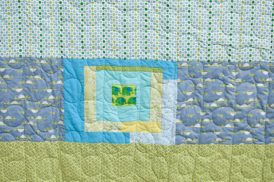 These simple quilts make trying new things such as quilting techniques (the loop pattern on the elephant one above), different batting (playing with Dream Puff), and different fabrics (I used a “minky” type on the elephant one) less intimidating. If something goes wrong you haven’t spent a ton of time working on a top, and stitches are easier to pull out with less piecing.