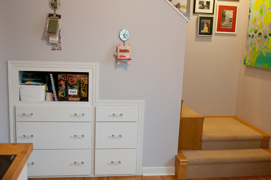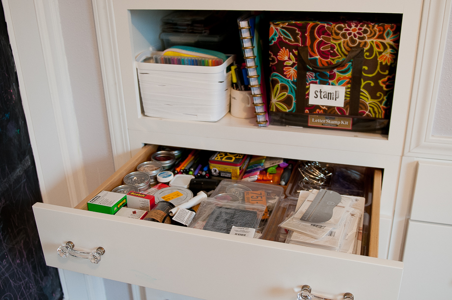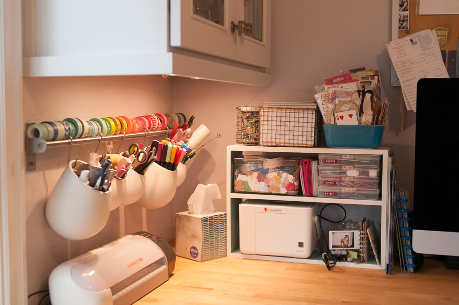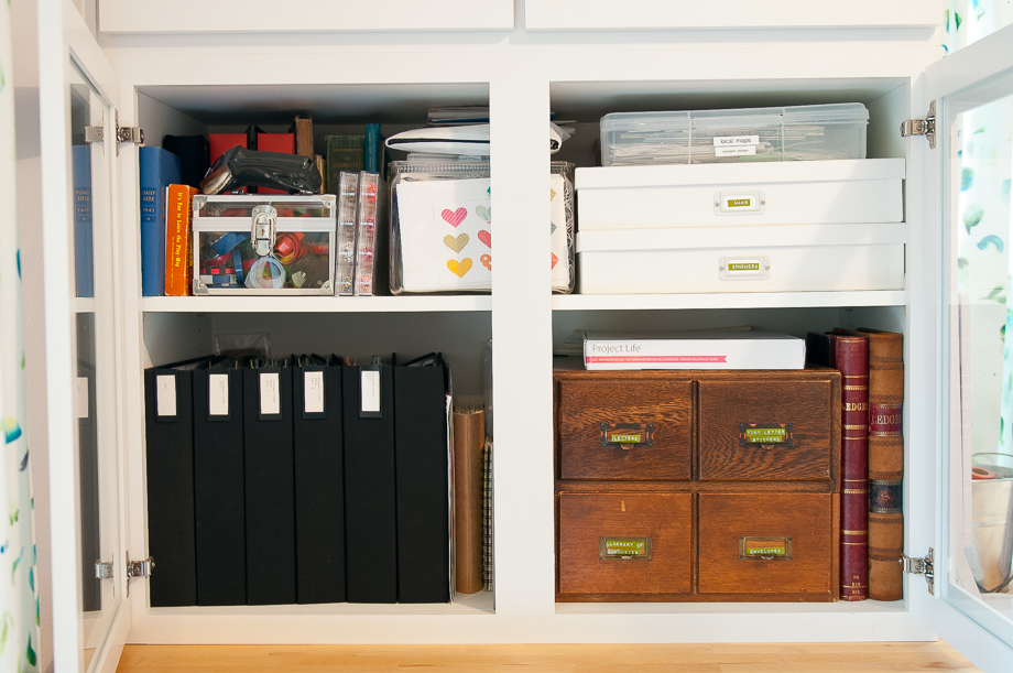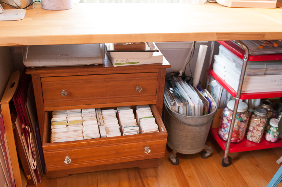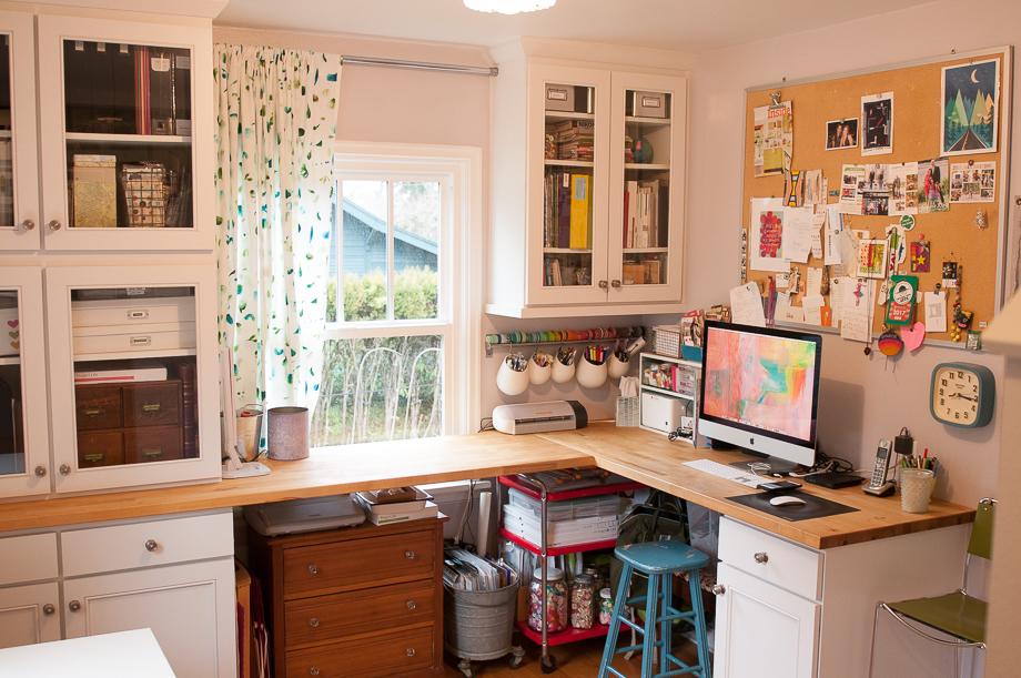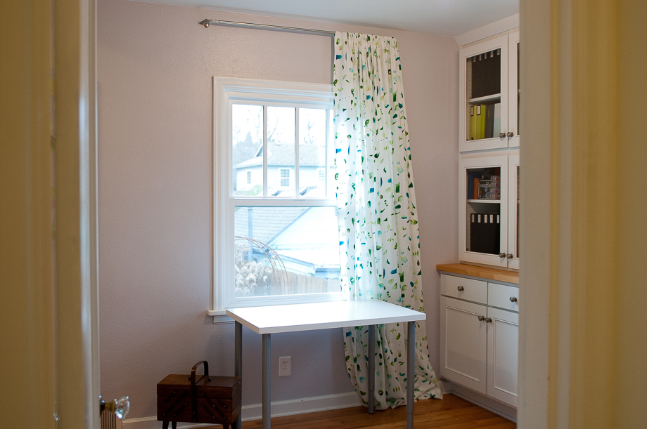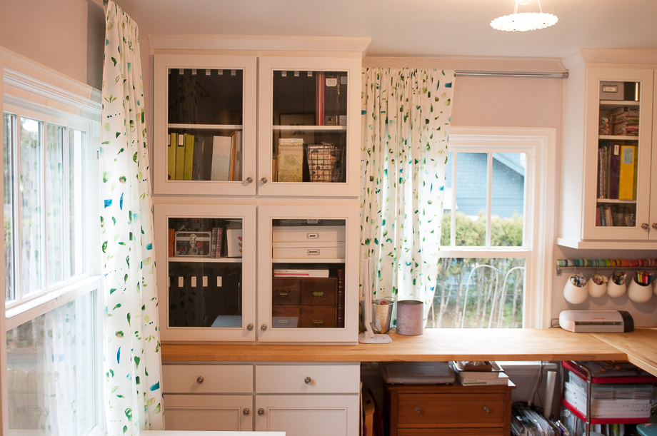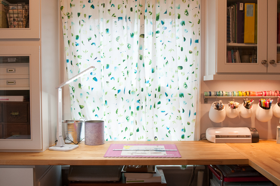 It has been a long time since I shared my craft room. I love seeing little glimpses that tell me I had a toddler at the time! Now that I have a 9 and 5 year old I don’t need that baby gate or little basket of baby toys. I’ve also changed the way I work and what I work on. Plus I’ve accumulated more crafting stuff, of course. Also there were things that never worked well, like the curtains on hooks. It may have looked neat but climbing on my desks to close them at night was so annoying. My mom and I were fabric shopping and I came across this beautiful double gauze. I bought the whole bolt to make these curtains and doing that made me revisit everything in the room. I ended up going through every single drawer, box, cupboard. Every little container filled with bits and bobbles. I packed up things I thought a friend would like and sent them off. I went through old charger cables and CDs with who know what on them. It felt so good and I’m really hoping I can keep it like this so that it’s ready for me to work in it at a moments notice. Enjoy these photos of my craft room and the little video I took at the end!