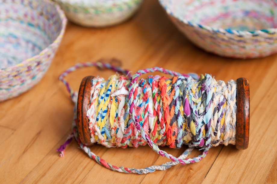 The bowl that is 9.5″ in diameter on the top used 4 ounces of recycled twine. The small one (about 6″ across) used about 1.6 ounces of twine. I was surprised how much this little spool of recycled twine made. I had packed the bobbin (a vintage one that was a gift) full over various car rides and kid activities, using a giant zip lock full of scraps. Last night when I went to make the bowls I was going to use it all up… but I still have a lot as you can see. The twine making process can be a bit fiddly at first but it becomes easy. Try to make enough for a small bowl and see if you like it.